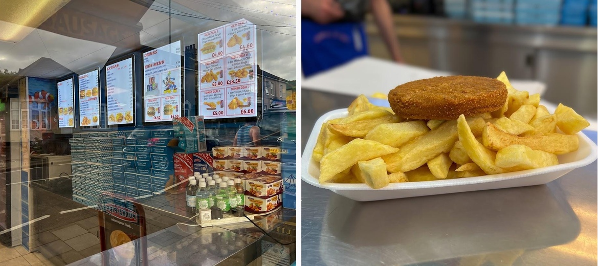 This takeaway shop specializes in traditional British fish and chips, juicy burgers, and crispy fried chicken, along with a variety of tasty sides.